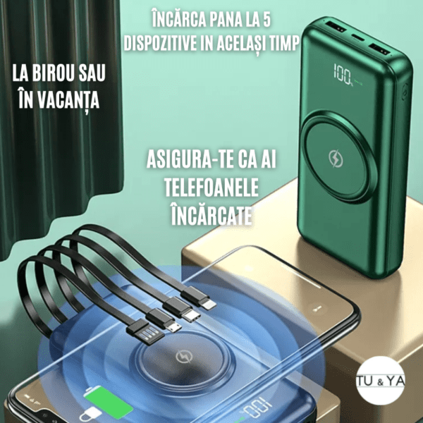 Baterie externa 10.000 mAh, wireless 4 in 1, 5w prin cablu, 4 Cabluri de alimentare
